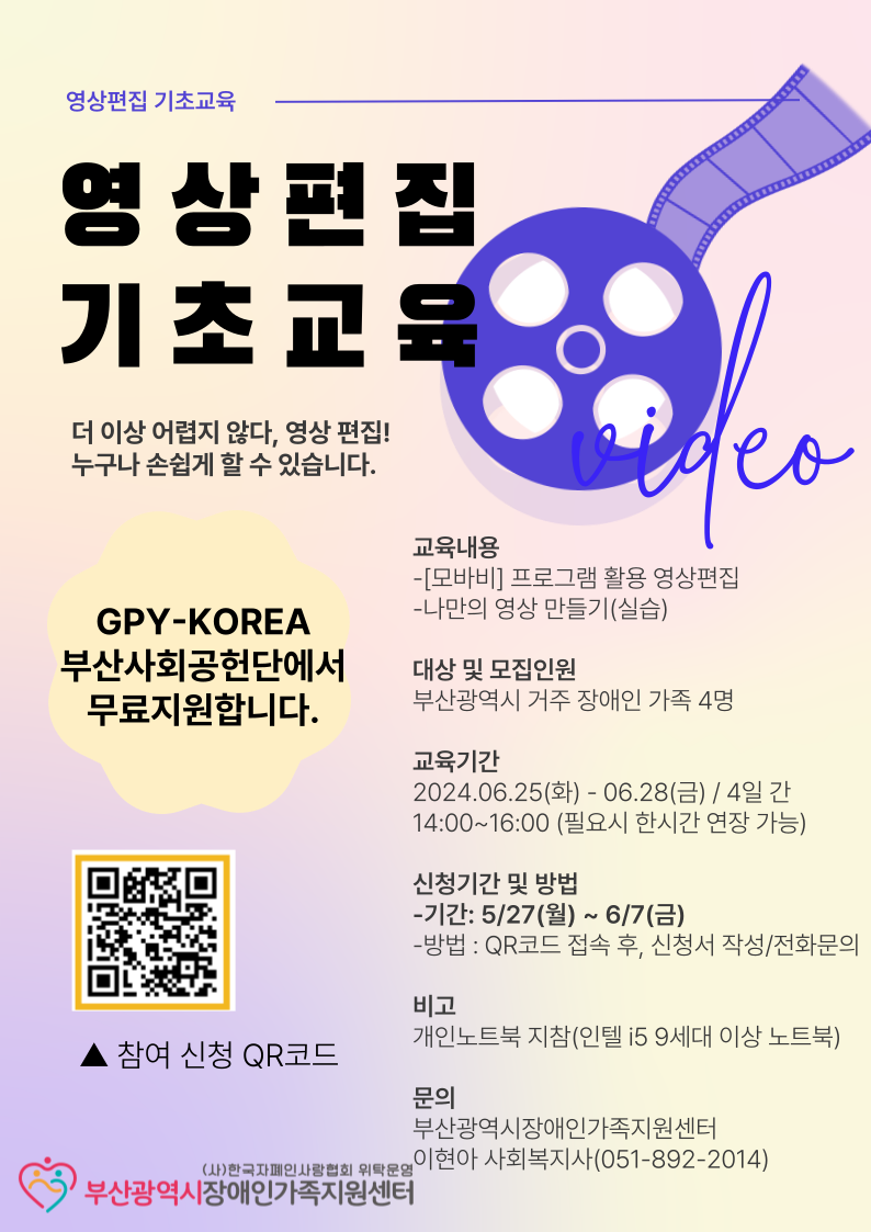 부산에 거주하고 있는 장애인가족이라면 누구든지~! 언제든지 활용할 수 있는 영상편집 기술을 익힐 수 있습니다.